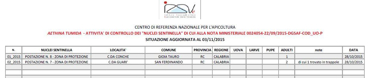 Jusqu’à présent, des coléoptères ont été détectés dans deux nuclei sentinelles en Calabre. Aucun petit coléoptère des ruches n’a été observé en Sicile depuis novembre 2014.
