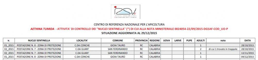 Aucun nouveau foyer d’A. tumida n’a été observé en Calabre depuis le 1er décembre 2015. Au total, depuis le 16 septembre 2015, 29 foyers d’A. tumida ont été observés en Calabre, tous situés dans la zone de protection. Quatre nuclei sentinelles ont été infestés par le petit coléoptère des ruches en Calabre.