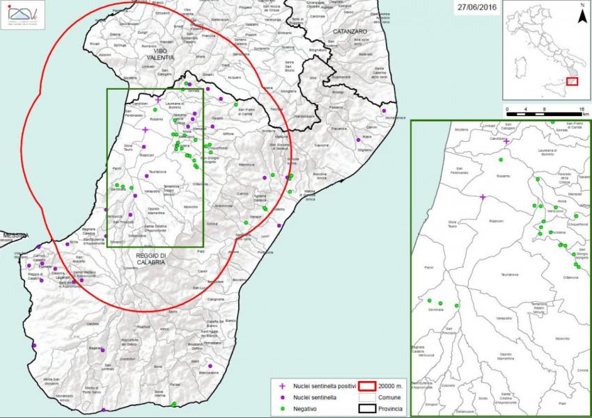 Le 17 juin 2016, huit Aethina tumida adultes et une larve ont été découverts dans un de ces nuclei sentinelles, situé dans la municipalité de Candidoni en Calabre (croix violette). Il s’agit du deuxième foyer détecté en 2016 en Calabre (le premier foyer a été mis en évidence en avril dernier).