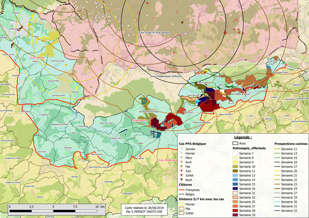 Synthèse des zones ratissées et prospectées avec chiens durant les 6 dernières semaines (avec les buffers de 5 et 7 km autour des cas belges des 6 dernières semaines)