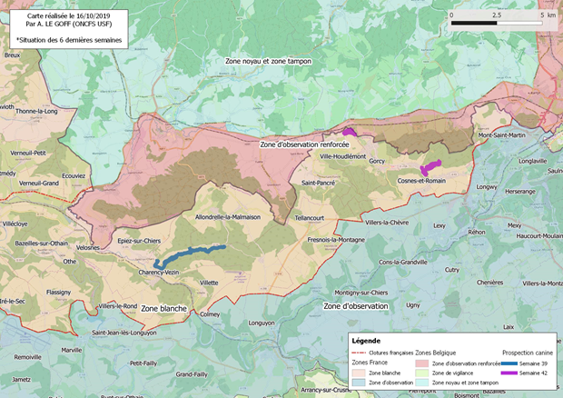 Synthèse des zones ratissées* et prospection canine depuis la semaine 32 (avec les buffers évolutifs de 5 et 7 km autour des cas belges)