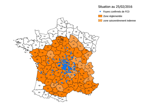 Figure 2 : Zones réglementées au 25/02/2016 et foyers de FCO à sérotype 8 détectés au 25 février 2016
