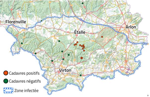 L’espace positif (périmètre à l’intérieur duquel des cas positifs ont été détectés) est désormais élargi pour inclure les zones de Buzenol, Ethe, Lagland et St-Léger. Une analyse comparative entre l’ADN de dix-sept premiers sangliers retrouvés, avec les profils génétiques des populations de sangliers d’autres pays européens est en cours.