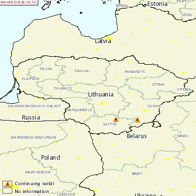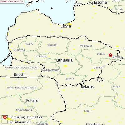 Evolution spatio-temporelle dans le pays (depuis l’état des lieux précédent) : Le foyer a été découvert dans le village Rupinskai, Kazitiskis, Ignalina, UTENA, dans la région frontalière avec la Biélorussie, loin de régions infectées précédentes (Alytus et Vilnius) (voir http://plateforme-esa.fr/index.php?option=com_content&;view=article&id=347:foyer-de-peste-porcine-africaine-en-lituanie&catid=79:actus-veille&Itemid=257)