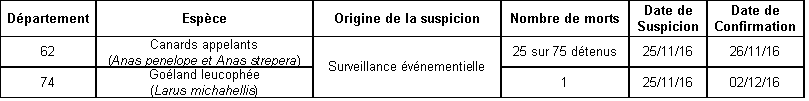 Tableau 2 : Caractéristiques des cas confirmés IAHP H5N8 dans l'avifaune captive et sauvage en France entre le 26/11/16 et le 13/12/16 (n=2)