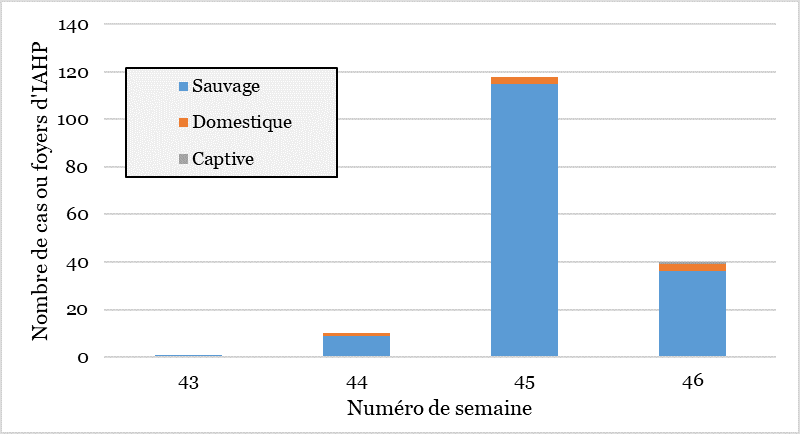 Figure 1. Nombre de cas ou foyers d’IAHP H5Nx par compartiment d’avifaune en Europe, confirmés entre le 20/10 et le 11/11/2020 inclus (source : Commission européenne au 12/11/2020 – 00h00). La semaine 46 n’intègre que les données des trois premiers jours